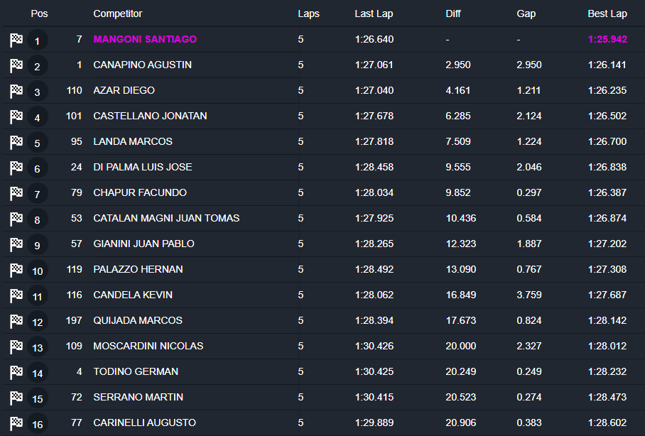El balcarceño del Canning Motorsports largó con la tranquilidad que le dio su compañero Agustín Canapino (Chevrolet Camaro), quien le anticipó que no lo iba a complicar en la partida. El arrecifeño tampoco pudo atacarlo en el desarrollo del parcial, que Mangoni ganó por una diferencia de 2s950. Así, celebró su 14º triunfo en 160 series disputadas, el primero desde Centenario 2025 y el segundo con el TC en Concepción (había ganado en 2022).