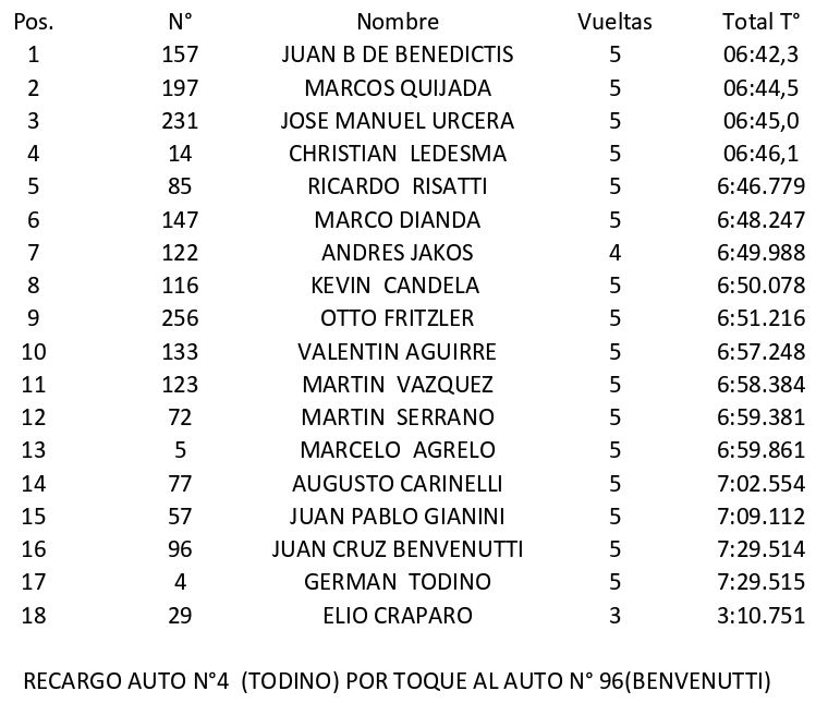 “Pude hacer una pequeña luz en la primera vuelta con la pelea entre Quijada y Urcera y eso me sirvió para administrar el ritmo. Sabía que la 1ª serie había sido muy rápida y apuntaba a asegurar un lugar en la 1ª fila de la Final”, manifestó De Benedictis en Campeones Radio y AM590 Continental.