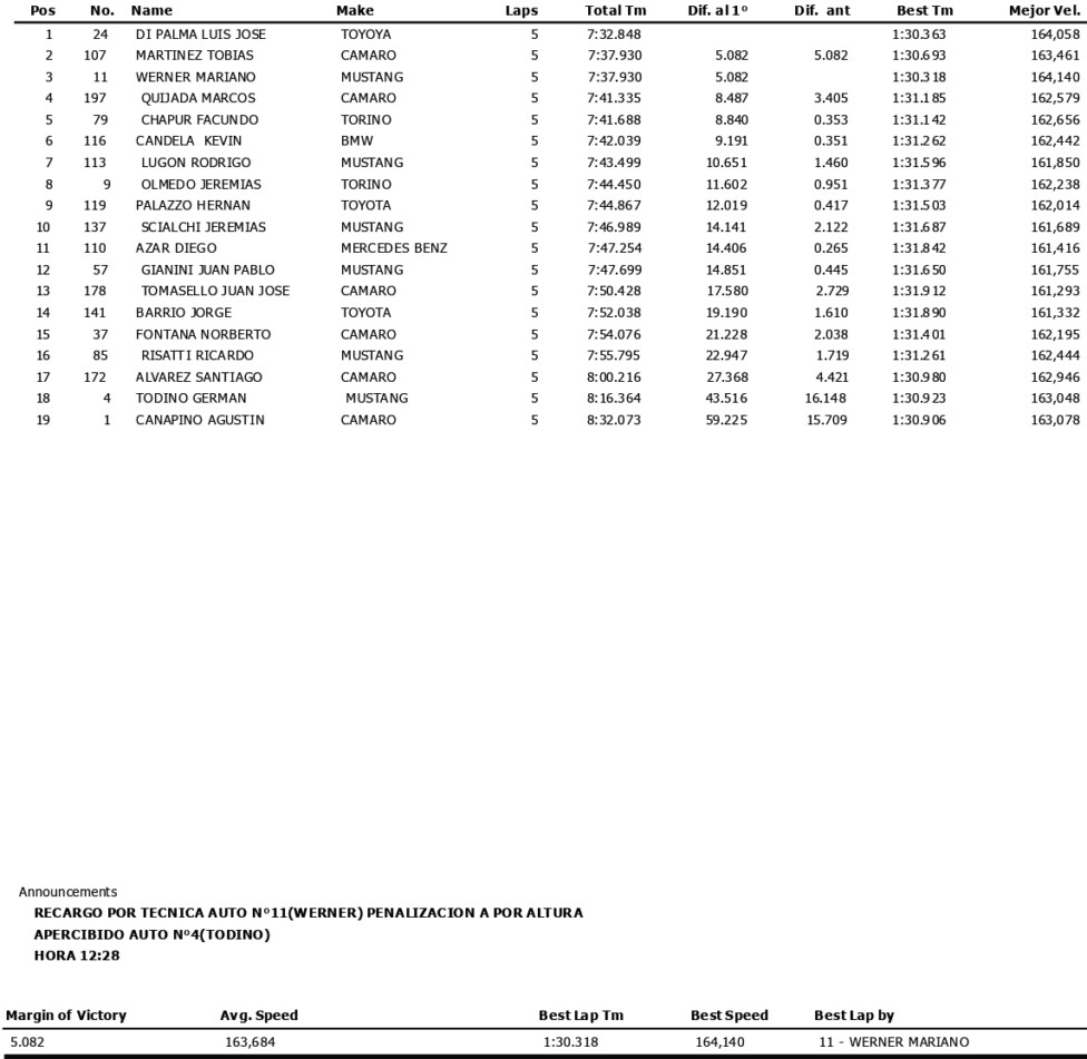 Una vez que pasó a comandar las acciones, el arrecifeño pudo contener el ataque del entrerriano, que llegó 2º pero quedó 3º porque recibió una penalización de 1 puesto por no dar la altura. “Picó mejor ‘Josito’, nada que decir. Fue una buena maniobra. El auto anduvo bien, entiendo que podemos estar mejor para la Final”, reconoció el piloto del Fadel Racing. De esta forma, Di Palma alcanzó su 17ª victoria en 178 series disputadas en la categoría, la 2ª con el RUS Med Team y la 1ª con Toyota, marca que representa desde esta temporada. Tobías Martínez (Chevrolet Camaro) heredó el 2º puesto y completó el «1-2» del equipo de Mauro Medina.