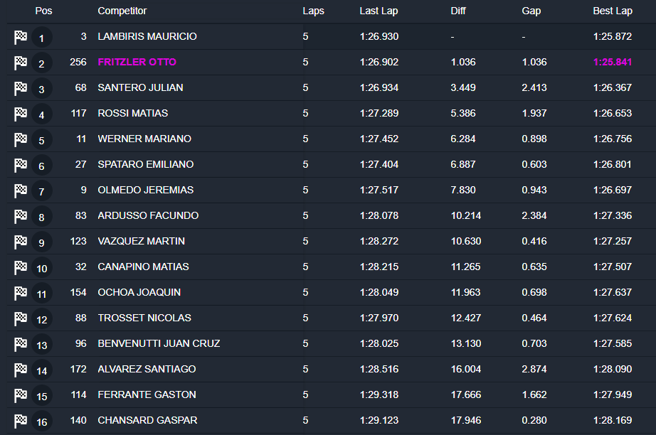 El uruguayo del Gurí Martínez Competición prevaleció con lo justo en la largada y a partir de ahí comandó las acciones sin sobresaltos, para finalmente superar al representante de San Miguel, que lo siguió de cerca sin llegar a inquietarlo, por 1s036. Fue su 19ª victoria en 150 series disputadas y la 2ª en el circuito entrerriano, donde había ganado un parcial con un Torino en 2015.