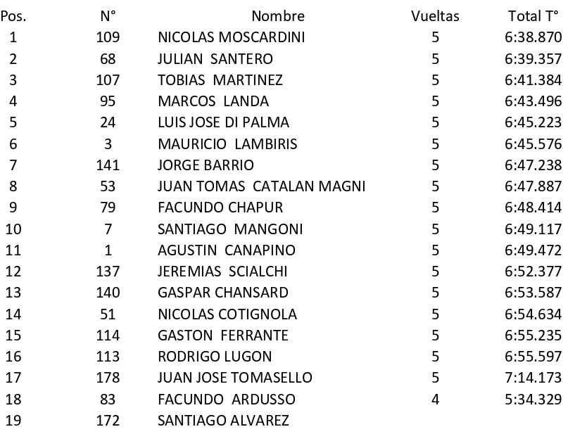 El piloto del Gurí Martínez Competición debió exigirse al máximo en los primeros metros para contener al mendocino, quien en su afán por saltar a la punta perdió la 2ª posición con Tobías Martínez (Chevrolet Camaro). Un exceso del sanjuanino le permitió a Santero recuperar el 2º puesto y volver a la carga por el liderazgo. Moscardini pudo sostenerse al frente y cruzó la meta con una diferencia de 0s487.