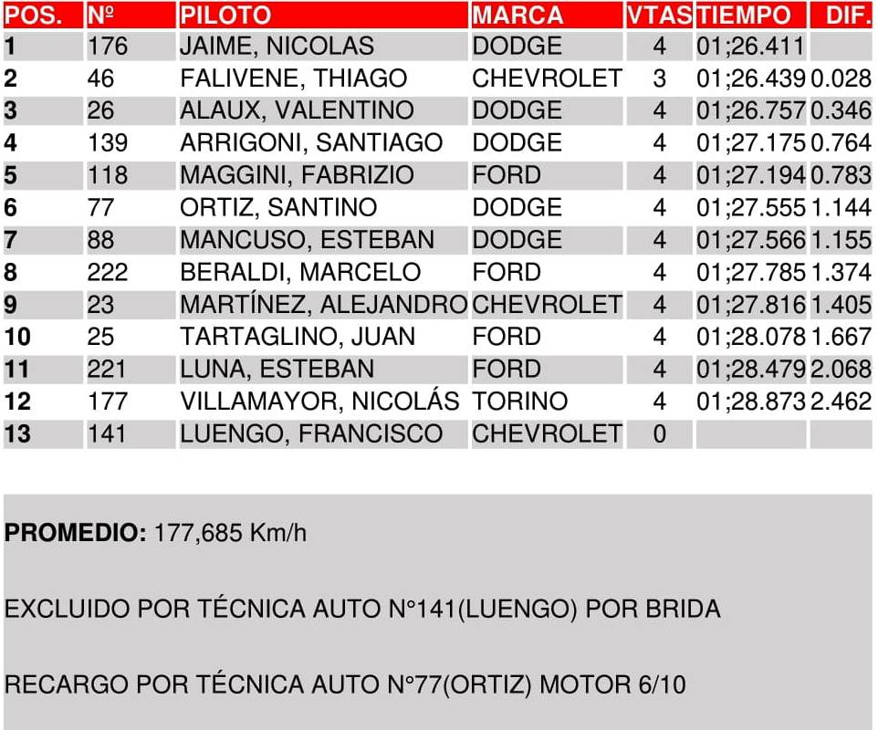 Detrás del piloto del RUS Med Team se ubicó otro monarca 2025 de monopostos: Valentino Alaux (Dodge), quien se consagró en la Fórmula 2 Argentina. El crédito de Trenque Lauquen quedó a 0s346 de Jaime y completó el “1-3” del Galarza Racing. Hubo otros dos representantes de Dodge entre los 5 mejores: Santino Ortiz (Tomás Abdala Racing), a 0s544, y Santiago Arrigoni (RUS Med Team), a 0s764. Fabrizio Maggini, que viene del Procar 4000, resultó el mejor Ford, en el 6º puesto, a 0s783.