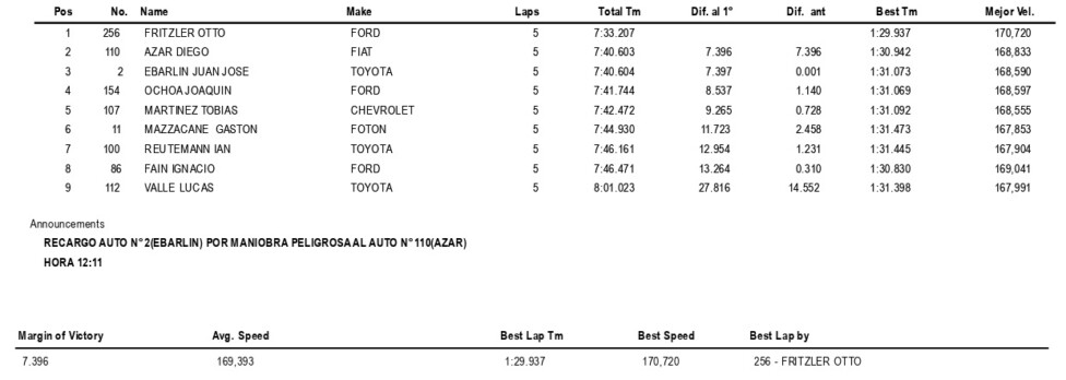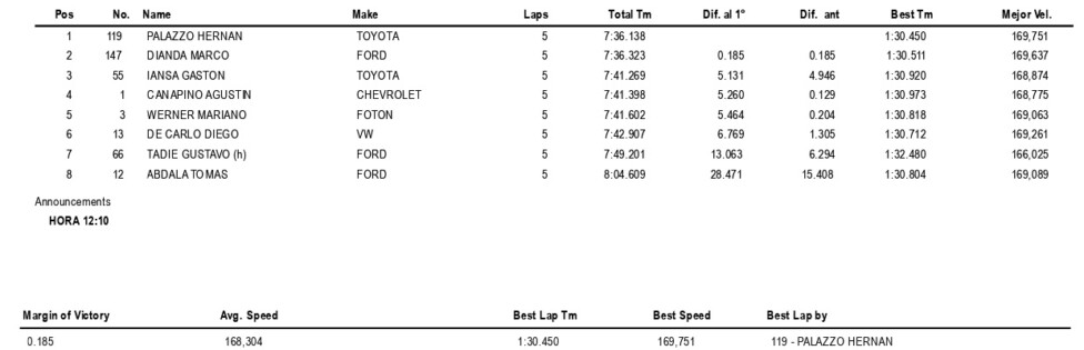 Por su parte, Gastón Iansa (Toyota Hilux) resistió los ataques de Agustín Canapino (Chevrolet S10) para quedarse con la 3ª posición. La diferencia entre ambos al cruzar la meta fue de 0s129, mientras que Mariano Werner (Foton Tunland G7) arribó 5º, a 0s209 del “Titán”.