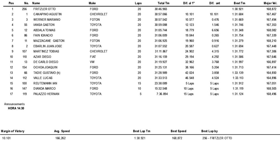 El representante de San Miguel no sufrió sobresaltos rumbo a su 2ª victoria en 12 participaciones en la categoría (había ganado el Premio Coronación 2025, también en el “Roberto Mouras”, en ocasión de su debut en el equipo de Venado Tuerto). Fritzler se impuso por 10s101 de ventaja, aunque cabe destacar que los abandonos de Hernán Palazzo (Toyota Hilux) y Marco Dianda (Ford Ranger), en momentos en los que ocupaban la 2ª posición, facilitaron su labor.