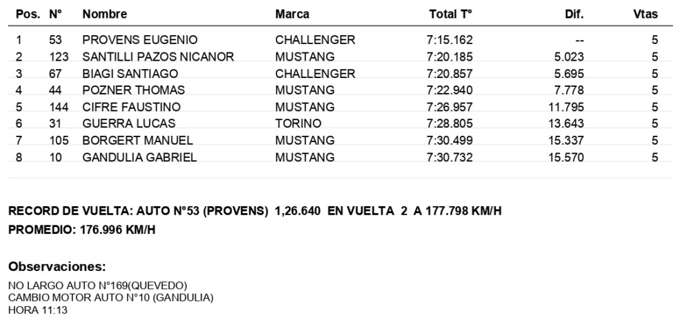 “Pude ‘patear’ muy bien en la largada, sabía que iba a tener la posibilidad de intentarlo por afuera en la curva 1. Cuando vi que Nicanor (Santilli Pazos) había quedado atrás, pude enfocarme en hacer mi carrera”, sostuvo Provens en Campeones Radio y AM590 Continental.