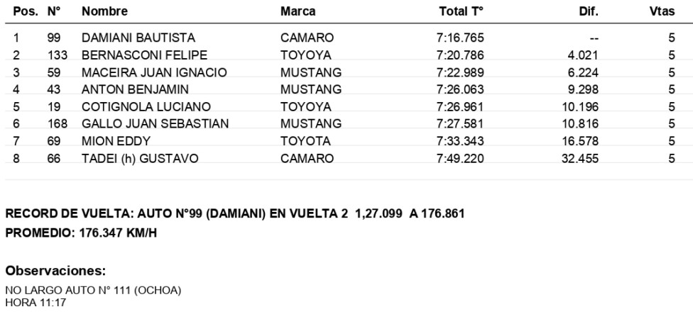 Bautista Damiani (Chevrolet Camaro) también logró un triunfo sin sobresaltos, aunque en su caso lo hizo largando desde la mejor posición. El piloto del Canning Motorsports alcanzó su 3º éxito parcial de la temporada tras superar a Felipe Bernasconi (Toyota Camry) por 4s021.