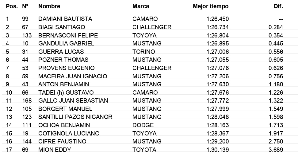 El piloto del Canning Motorsports, que dominó una práctica por 3ª vez en la temporada, estableció un tiempo de 1m26s450 y superó por 0s284 a Santiago Biagi (Dodge Challenger), el último ganador de la categoría, y por 0s354 a Felipe Bernasconi (Toyota Camry), el último “poleman” del TCP.