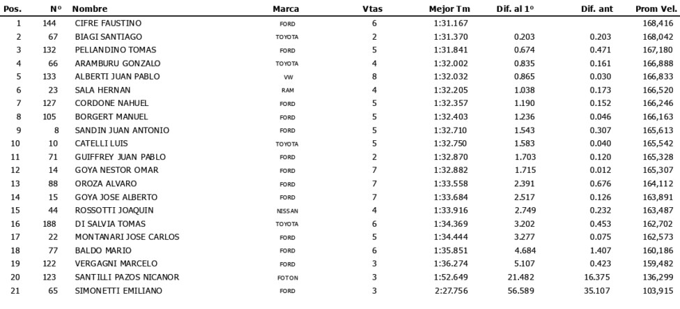 El piloto del Giavedoni Sport, que viene de ser 11º y 4º en las dos primeras Finales de la temporada, marcó un tiempo de 1m31s167 y postergó por 0s203 a Santiago Biagi (Toyota Hilux), que quedó en el 2º lugar. Tomás Pellandino (Ford Ranger), el líder del campeonato y último ganador de la categoría, se ubicó 3º a 0s674.