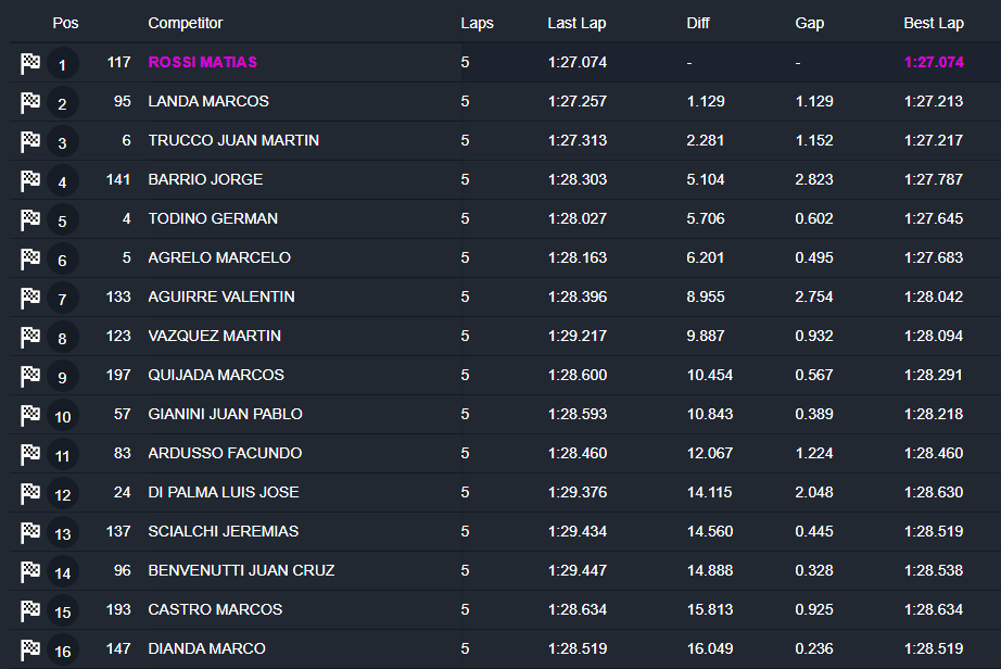 El piloto del Pradecon Racing, que largó desde la “pole position”, sostuvo el ataque inicial del uruguayo, que buscaba su primer éxito parcial en la categoría. Una vez consolidó la primera posición, Rossi comenzó a distanciarse al girar 2 décimas por vuelta más rápido que Landa y se impuso por una diferencia de 1s129.