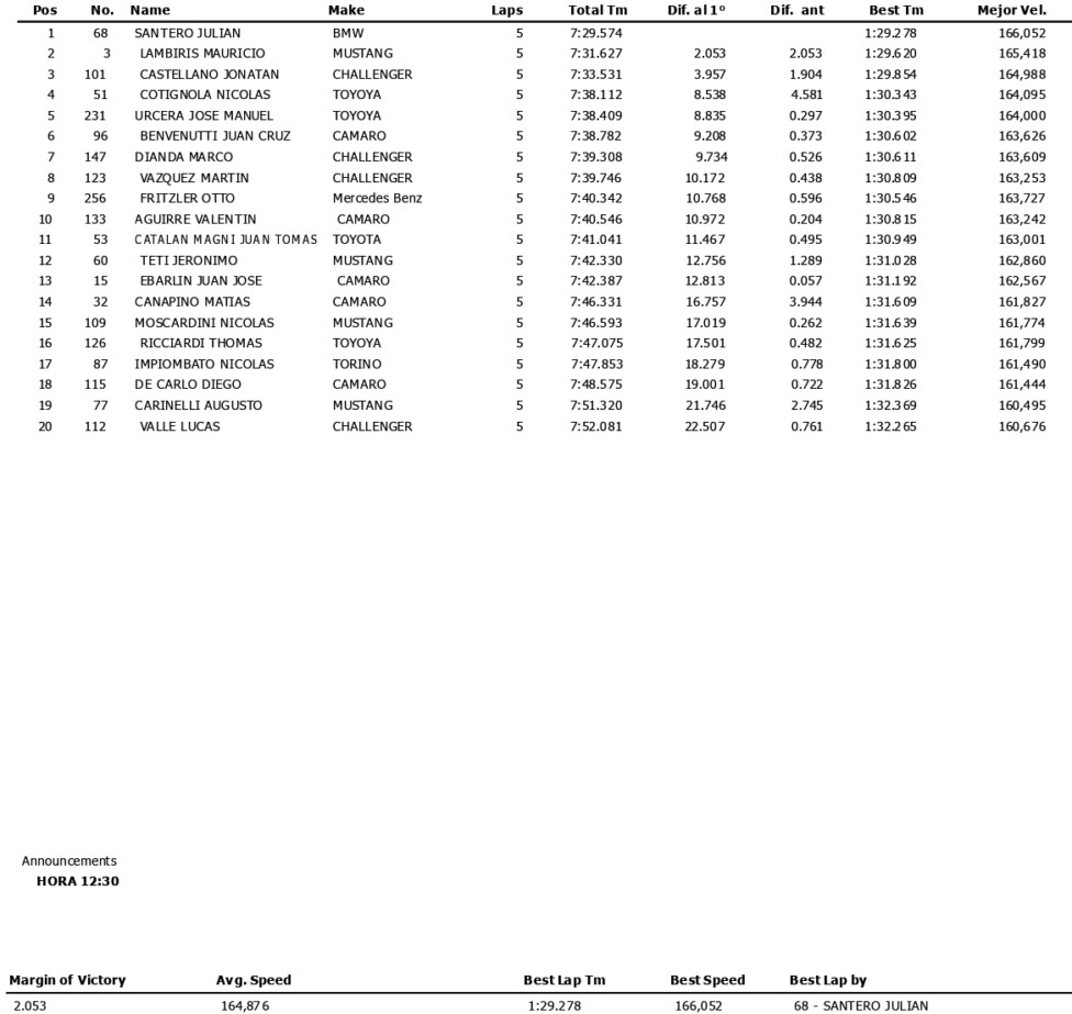 El piloto del BMW Motorsport se impuso de punta a punta y consiguió su 29ª victoria parcial en 107 series disputadas en TC y la 5ª en el circuito rionegrino. “Mauri (Lambiris) tiene un gran ritmo, pero al venir atrás mío tenía el aire sucio que lo complicaba. Yo me tengo que comparar con los ganadores de las otras series, y posiblemente me favorezca el clima porque estará más caluroso en las otras dos baterías. Hay detalles del auto que me gustaría equilibrar un poco más”, indicó Santero en Campeones Radio y AM590 Continental.