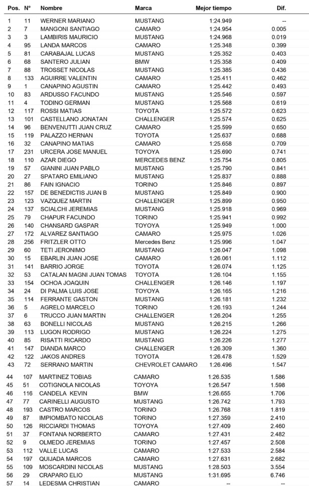 Pese a una falla en el motor que le impidió aprovechar al máximo los 30 minutos de la segunda tanda de entrenamientos, Santiago Mangoni (Chevrolet Camaro) fue 2º a sólo 0s005 de Werner. Mauricio Lambiris (Ford Mustang) también quedó a menos de una décima del tricampeón, más precisamente a 0s019.