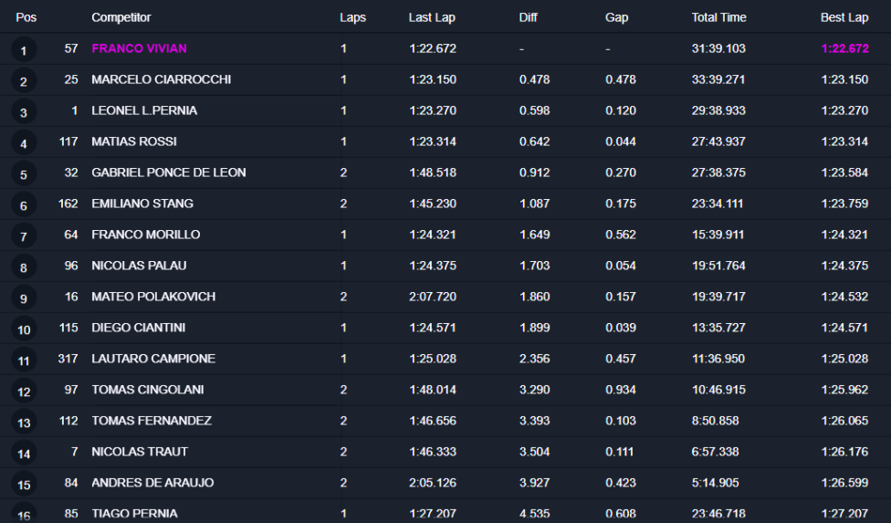 Leonel Pernía (Honda ZR-V) clasificó 3º a 0s598 en su despedida del «1», por delante de Matías Rossi (Toyota Corolla Cross), que fue 4º a 0s642. Gabriel Ponce de León (Toyota Corolla Cross) se ubicó 5º a 0s912, mientras que Emiliano Stang (Toyota Corolla Cross) quedó 6º a 1s087.