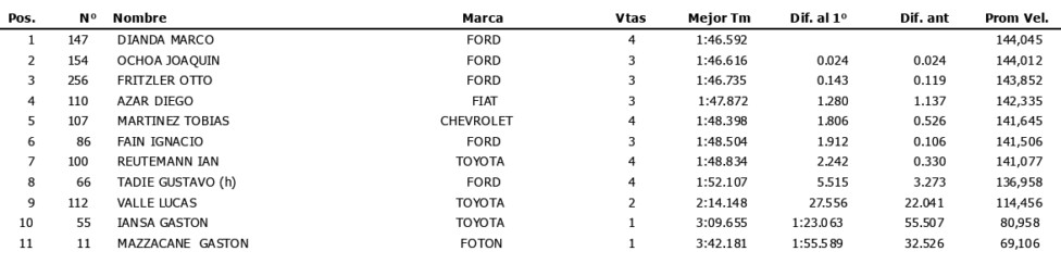 El cordobés del Gurí Martínez Competición marcó un tiempo de 1m46s592 y superó por 0s024 a Joaquín Ochoa (Ford Ranger), otro de los debutantes que tiene la categoría este año. Otto Fritzler (Ford Ranger) quedó a 0s143 y completó el “1-2-3” del “Óvalo”.