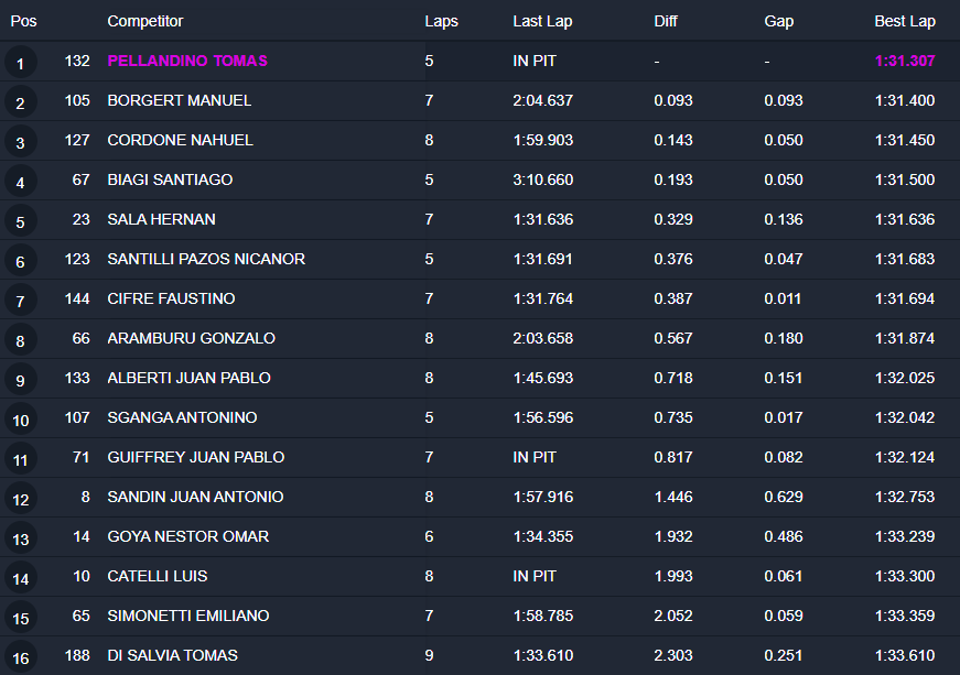 El piloto del SAP Team, que lidera el campeonato de TCPPK, estableció un tiempo de 1m31s307 para su mejor vuelta y resultó 0s093 más rápido que Manuel Borgert (Ford Ranger), que completó el “1-2” de los entrerrianos. Pellandino no pudo mejorar el registro logrado por Faustino Cifre (Ford Ranger) en el primer ensayo, del que quedó a 0s140.
