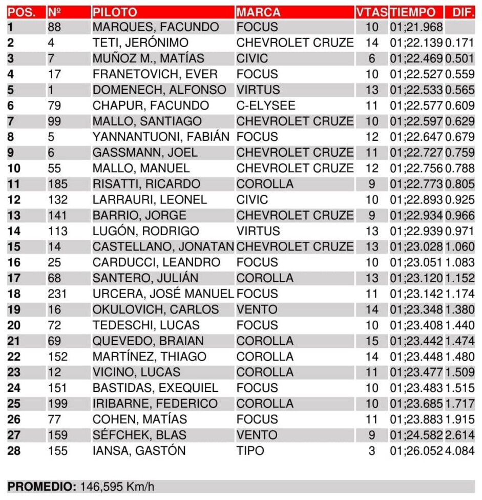 García, que tiene 3 victorias en la división mayor del TN y ganó 3 veces los “200 Kilómetros” de TC2000 como invitado de Leonel Pernía, marcó 1m21s968 y bajó en 0s513 el mejor tiempo del viernes, que había establecido Fabián Yannantuoni (Ford Focus), compañero de equipo de Marques en el Ambrogio Racing.