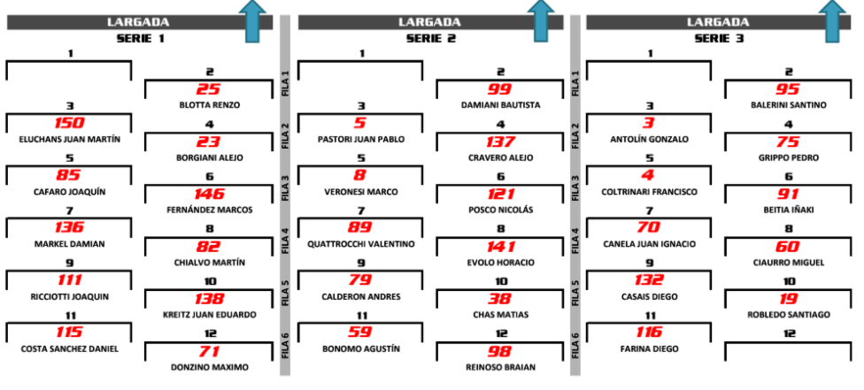 Las series serán a 5 vueltas y se correrán hoy. La 1ª se largará a las 14:30, con Renzo Blotta (Toyota Etios) y Juan Martín Eluchans (Toyota Yaris) en la 1ª fila. Bautista Damiani (Toyota Yaris) y Juan Pablo Pastori (Chevrolet Onix) partirán adelante en la 2ª batería, que comenzará a las 15:05. El 3º parcial, en tanto, se pondrá en marcha a las 15:50, con Santino Balerini (Peugeot 208) y Gonzalo Antolin (Peugeot 208) en las mejores posiciones de largada.