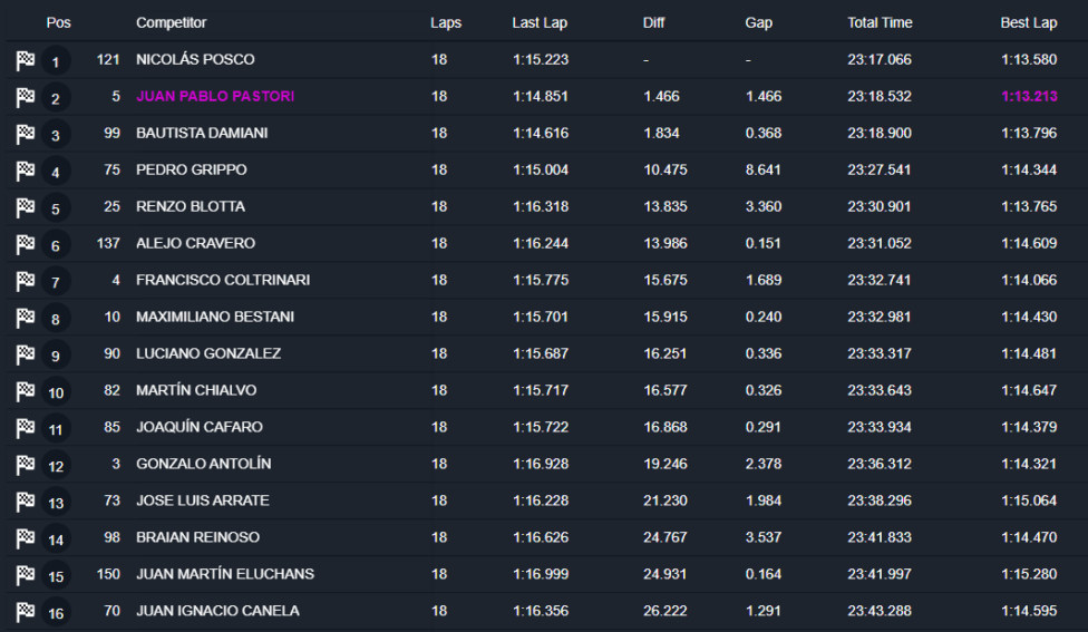 Juan Pablo Pastori (Chevrolet Onix) largó 3º y en la largada superó a Bautista Damiani (Toyota Yaris) para adueñarse del 2º lugar en el que giró a lo largo de las 18 vueltas de la Final, sin poder inquietar seriamente a Posco. De todos modos, el misionero, que obtuvo su 4º podio de la temporada, hizo negocio, ya que es el nuevo escolta en el campeonato de Gonzalo Antolín (Peugeot 208), de quien lo separa apenas 1 punto.