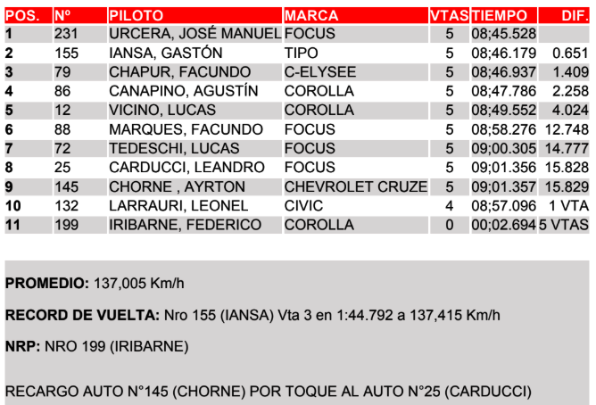 El piloto del Larrauri Racing superó en la partida a Gastón Iansa (Fiat Tipo) y Facundo Chapur (Citroën C-Elysée), los integrantes de la 1ª fila que se intercambiaron posiciones en el primer giro. El “Misil” de San Vicente acosó a “Manu” pero no lo pudo doblegar y terminó a 0s651 del ganador, que cosechó su 3ª victoria en series de la temporada 2025.