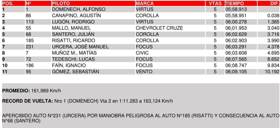 La primera serie de la la Clase 3 del TN en el autódromo de Río Cuarto, donde se disputa la 11ª y anteúltima fecha del campeonato 2025, entregó un ajustado y atractivo desenlace que mostró ganador a Alfonso Domenech (VW Virtus) por apenas 0s038 de diferencia sobre Agustín Canapino (Toyota Corolla).