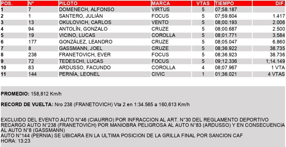 Finalmente, Domenech pudo doblegar a Santero, quien destacó la falta de potencia en el motor del Focus que prepara Esteban Pou, en la 4ª y anteúltima vuelta cronometrada. Ever Franetovich (Ford Focus) aprovechó la ajustada maniobra del campeón 2024 para quedarse con la 2ª posición, a 0s961 del ganador, aunque luego el santafesino fue recargado por maniobra peligrosa y el mendocino fue el escolta.