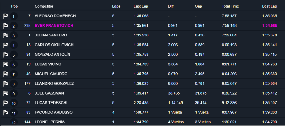 Finalmente, Domenech pudo doblegar a Santero, quien destacó la falta de potencia en el motor del Focus que prepara Esteban Pou, en la 4ª y anteúltima vuelta cronometrada. Ever Franetovich (Ford Focus) aprovechó la ajustada maniobra del campeón 2024 para quedarse con la 2ª posición, a 0s961 del ganador.