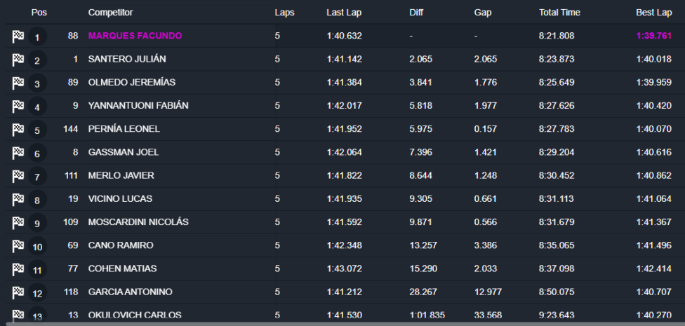 El cordobés de Río Cuarto alcanzó su 1ª victoria parcial en la categoría con el Ford Focus del Ambrogio Racing, equipo que viene de ganar en Turismo Carretera 2000, con Facundo Ardusso, y en Turismo Carretera, con Julián Santero. Precisamente el mendocino escoltó a Marques en esta 2ª batería, luego de superar con el Focus del GR Competición a Jeremías Olmedo (Chevrolet Cruze) en la 2ª vuelta.