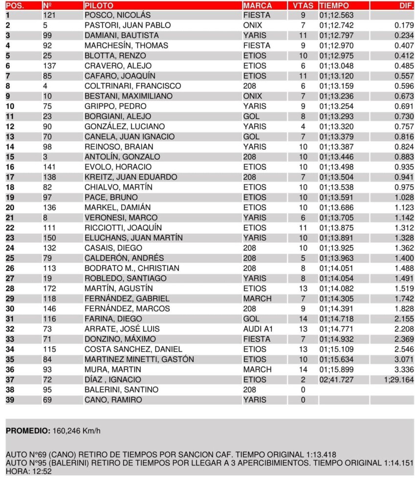 Posco, que había quedado a 0s434 de Bautista Damiani (Toyota Yaris), el “poleman” del viernes, marcó un tiempo de 1m12s563 y bajó en 0s317 el registro del porteño de 20 años. De esta manera, el bicampeón, que está 9º en el campeonato, sumó los 3 primeros puntos en juego del fin de semana y quedó a 49 unidades del líder Gonzalo Antolin (Peugeot 208) cuando quedan 102 en juego.