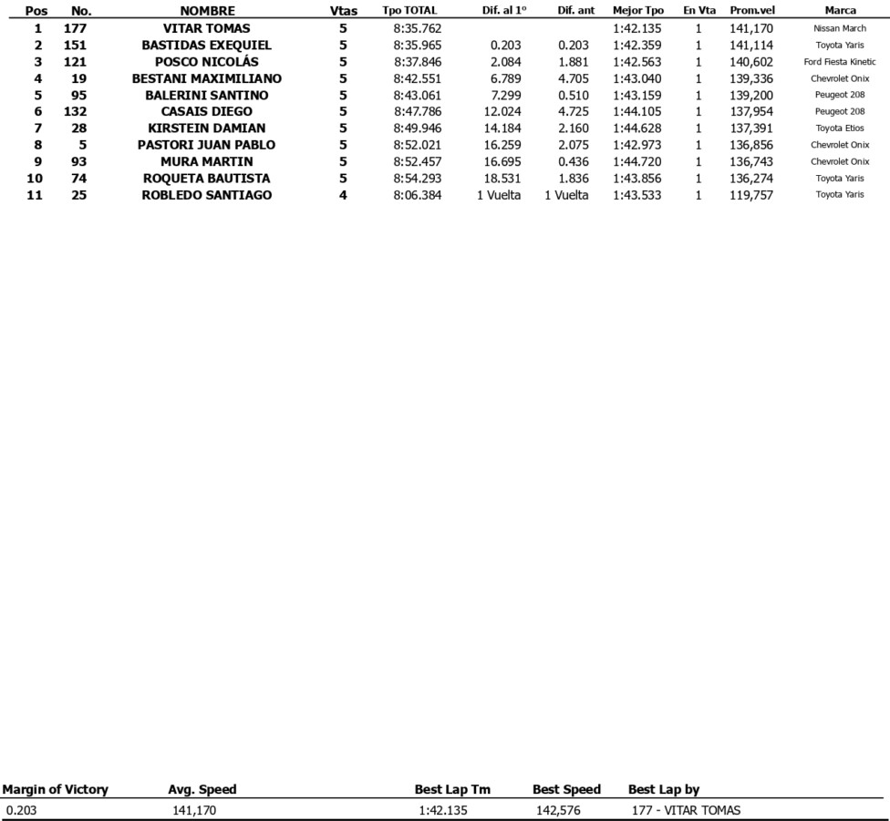 La serie que abrió la mañana en Córdoba quedó en poder de Tomás Vitar (Nissan March), quien superó en la 1ª vuelta al “poleman” Exequiel Bastidas (Toyota Yaris) y luego contuvo al paranaense, que llegó 2º a 0s203. El mendocino de 22 años sigue invicto esta temporada, ya que disputó dos parciales y se impuso en ambos.