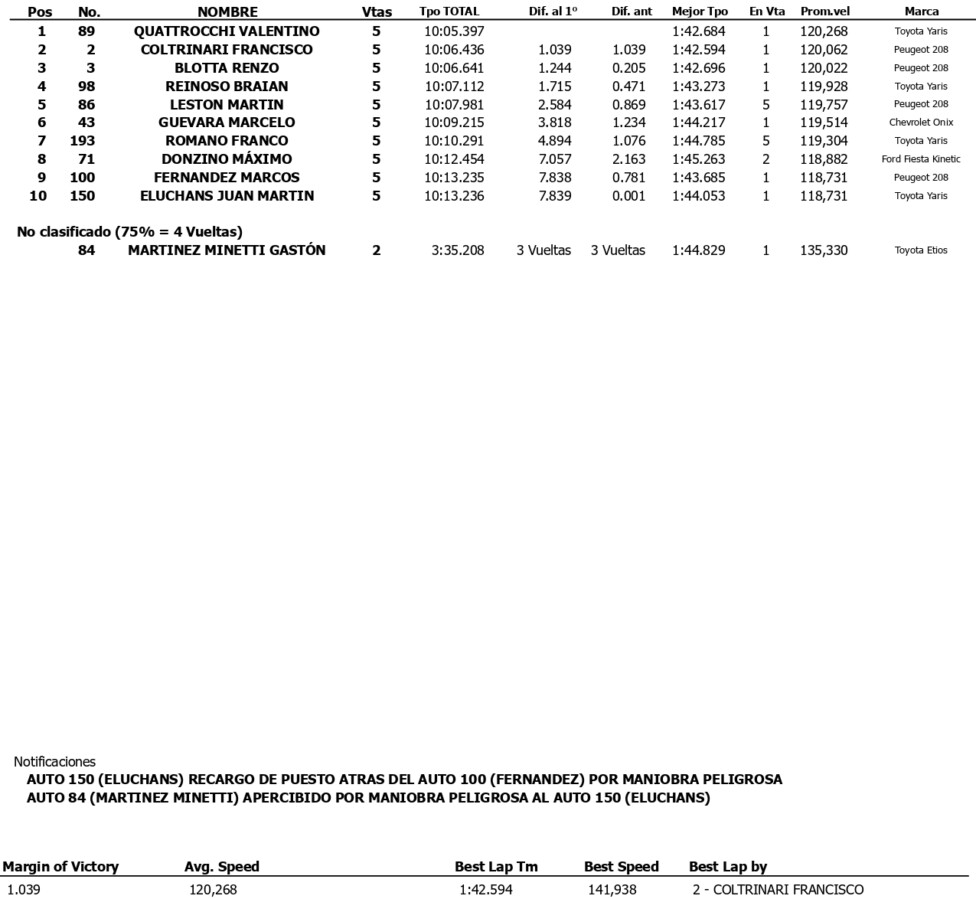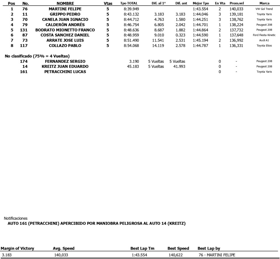 Felipe Martini (VW Gol Trend) logró su 1ª victoria parcial en el TN Clase 2 luego un comienzo en el que debió defenderse de Pablo Collazo (Toyota Etios). El santacruceño fue superado en la 2ª vuelta por su coterráneo Pedro Grippo (Toyota Yaris), quien no pudo inquietar al de Roque Pérez.
