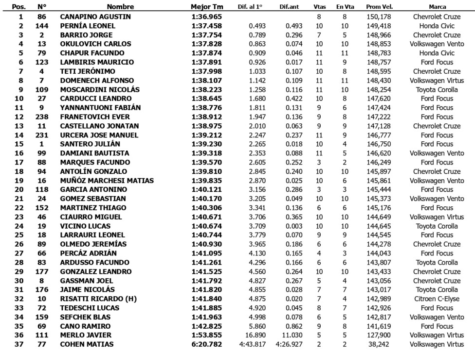 Jorge Barrio (Chevrolet Cruze) se ubicó 3º 0s789, por delante de Carlos Okulovich (VW Vento), que fue 4º a 0s863. Con 36 kilos de lastre por su 3º puesto en Paraná, Facundo Chapur (Honda Civic) cerró el grupo de los 5 más rápidos, a 0s909 de Canapino.