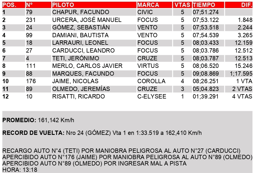 El cordobés del Larrauri Racing largó desde la “pole” y sólo en la partida vio amenazado su condición de líder. En esa instancia, José Manuel Urcera (Ford Focus) superó a Sebastián Gómez (VW Vento) pero el piloto del GR Competición no estuvo en condiciones de seguir el ritmo del Civic de Chapur, quien obtuvo su 37º triunfo parcial en la Clase 3 del TN. “Manu”, que en las últimas horas sufrió la muerte de su abuelo Ernesto, llegó a 1s848 del ganador, más ocupado en defender el 2º lugar del santacruceño, de quien lo separaron apenas 0s396.