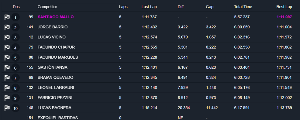 El cordobés de Río Tercero pudo mantener el liderazgo en la largada pese al ataque de Jorge Barrio (Chevrolet Cruze), quien no pudo saltar a la punta pero sí pudo doblegar a Lucas Vicino (Toyota Corolla), quien había partido desde la 2ª posición. Luego, imprimió un ritmo veloz para ganar por una diferencia de 3s422 sobre el piloto del Febase Performance, quien con el 2º puesto le descontó 3 puntos a Julián Santero (Toyota Corolla). De esta manera, el pinamarense está obligado en la Final a reducir en 11 unidades la brecha con el mendocino para prolongar la definición al Coronación.