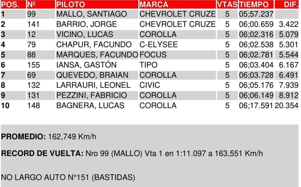 El cordobés de Río Tercero pudo mantener el liderazgo en la largada pese al ataque de Jorge Barrio (Chevrolet Cruze), quien no pudo saltar a la punta pero sí pudo doblegar a Lucas Vicino (Toyota Corolla), quien había partido desde la 2ª posición. Luego, imprimió un ritmo veloz para ganar por una diferencia de 3s422 sobre el piloto del Febase Performance, quien con el 2º puesto le descontó 3 puntos a Julián Santero (Toyota Corolla). De esta manera, el pinamarense está obligado en la Final a reducir en 11 unidades la brecha con el mendocino para prolongar la definición al Coronación.