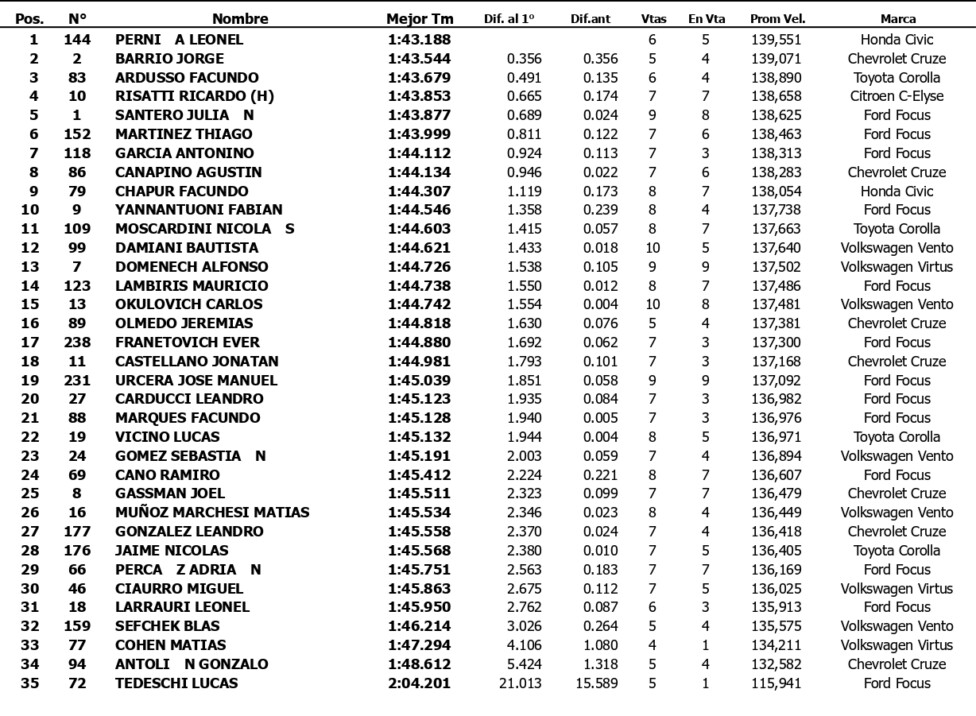 Agustín Canapino (Chevrolet Cruze), que viene de ganar en el “Oscar Cabalén”, marcó el 8º mejor tiempo en el circuito de 4.000 metros, a 0s946. Por su parte, Facundo Chapur (Honda Civic), el líder del campeonato, se posicionó inmediatamente por detrás del arrecifeño, a 1s119 de Pernía.