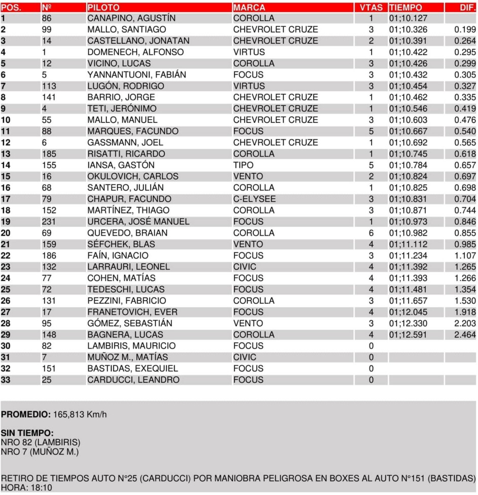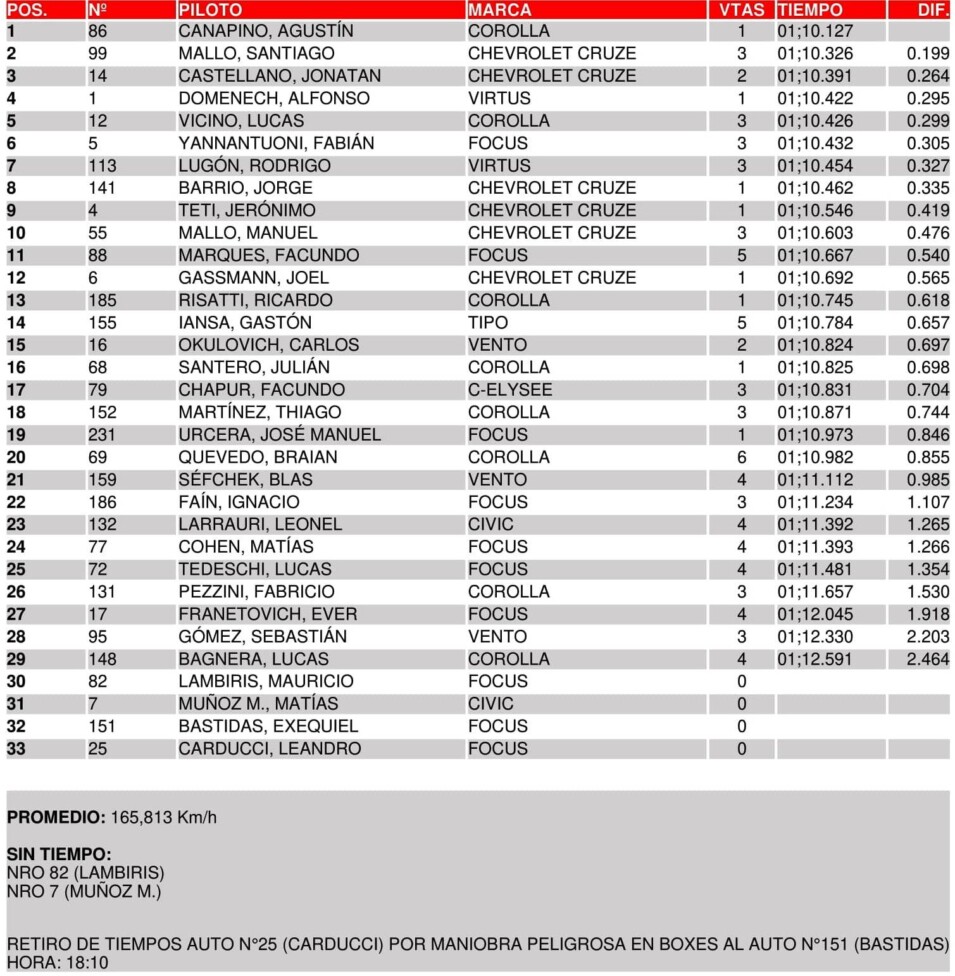 Pese a que giró solo y sin succión, el arrecifeño anotó su nombre entre los 10 “poleman” de la temporada para la Clase 3 (Facundo Chapur fue el único que repitió). Canapino, que tiene motores de Esteban Pou, estableció un tiempo de 1m10s127 para su mejor vuelta y postergó al segundo lugar a Santiago Mallo (Chevrolet Cruze) por 0s199. El cordobés protagonizó su mejor resultado clasificatorio desde la “pole” en El Villicum, en la 4ª fecha.