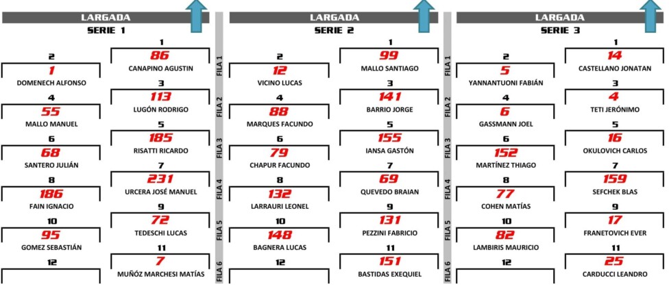Mañana se disputarán las series -a 5 vueltas- en Río Cuarto. La 1ª se largará a las 10:05, con Agustín Canapino (Toyota Corolla) y Alfonso Domenech (VW Virtus) en la 1ª fila. Santiago Mallo (Chevrolet Cruze) y Lucas Vicino (Toyota Corolla) partirán adelante en la 2ª batería, que comenzará a las 10:35. El 3º parcial, en tanto, se pondrá en marcha a las 11:00, con Jonatan Castellano (Chevrolet Cruze) y Fabián Yannantuoni (Ford Focus) en las mejores posiciones de largada.