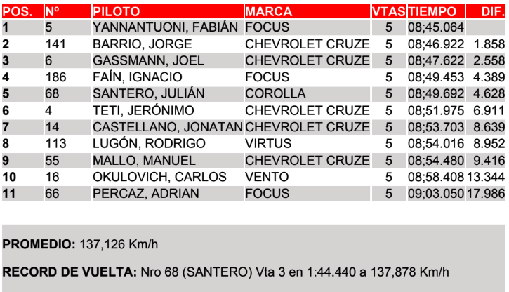 Jorge Barrio (Chevrolet Cruze) terminó a 1s858 del “Patito” luego de largar 4º y superar en la largada a Julián Santero (Toyota Corolla), que cayó del 3º al 6º puesto en la partida. El mendocino, que pase lo que pase se irá de Rosario como líder del campeonato, finalmente recuperó una posición para culminar 5º.