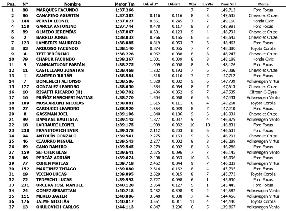 El piloto del Ambrogio Racing, que había sido 17º en la primera práctica, cronometró 1m37s266 para su mejor vuelta, aunque no pudo bajar el tiempo que había logrado Agustín Canapino (Chevrolet Cruze) en el primer ensayo, y quedó a 0s301 del “Titán”. El arrecifeño también se mostró competitivo en este segundo entrenamiento, ya que fue 2º a 0s116 de Marques.