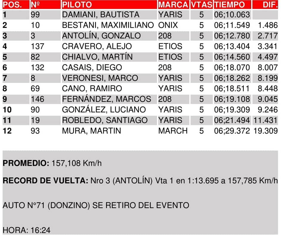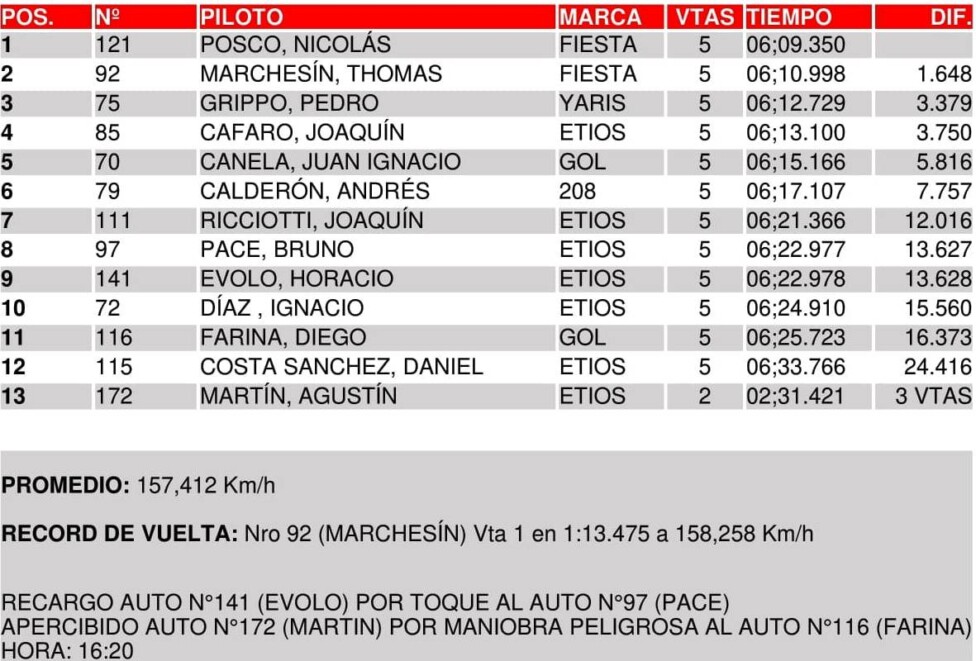 El “poleman” Posco construyó una victoria inobjetable de principio a fin para superar a Thomas Marchesín (Ford Fiesta Kinetic), que debuta como titular en la Clase 2, por 1s648. El representante de Moreno obtuvo así su 2ª victoria parcial de la temporada (la otra había sido en Viedma) y la 28ª en su campaña en la división menor del TN.
