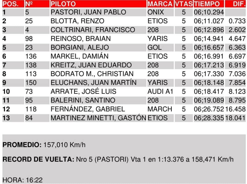 Pastori prevaleció sobre Renzo Blotta (Toyota Etios) en la segunda batería, y si bien también ganó de punta la diferencia con el chubutense fue de sólo 0s733. El misionero, que ganó en la visita a Río Cuarto de mayo de este año con el Onix del JPM Racing, obtuvo su 4º triunfo en series de 2025 y el 7º en la categoría.