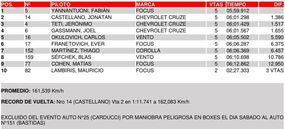 El “Patito”, que venía de ganar la 2ª serie en Rosario, superó en la largada a Jonatan Castellano (Chevrolet Cruze), que terminó a 1s386 del santafesino de Capitán Bermúdez. “Pudimos definirlo en la largada, sino después iba a ser difícil. Creo que fue una buena serie y pudimos defendernos bien de Jonatan (Castellano), que siempre tiene un estilo agresivo de ir a buscar”, señaló Yannantuoni en AM590 Continental y Campeones Radio.