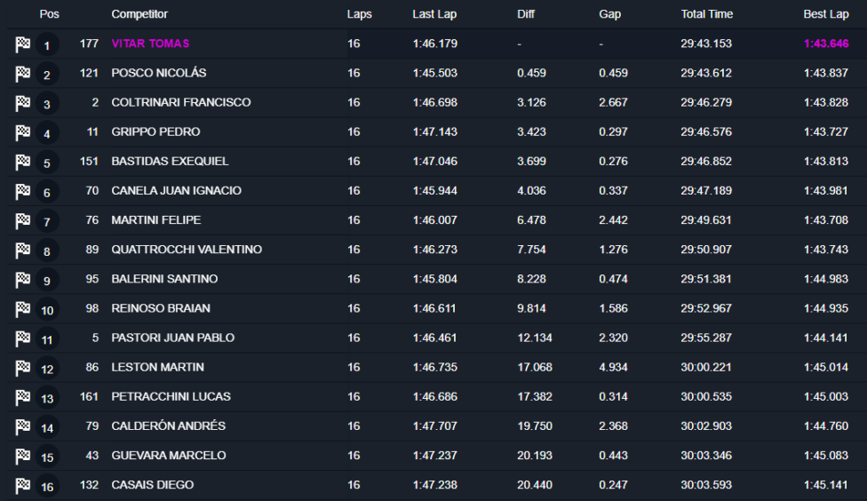 El campeón 2025 de la Clase 3 del Turismo Pista, categoría en la que registra victorias en cada una de sus 3 divisiones, sostuvo una entretenida pelea con Felipe Martini (VW Gol Trend) y, en menor medida, con Pedro Grippo (Toyota Yaris). El frustrado intento del piloto de Roque Pérez de saltar a la punta en la 9ª vuelta, que incluyó un áspero toque lateral con Vitar, le permitió al santacruceño aprovechar la situación para superar al piloto del Giacone Competición y colocarse 2º.