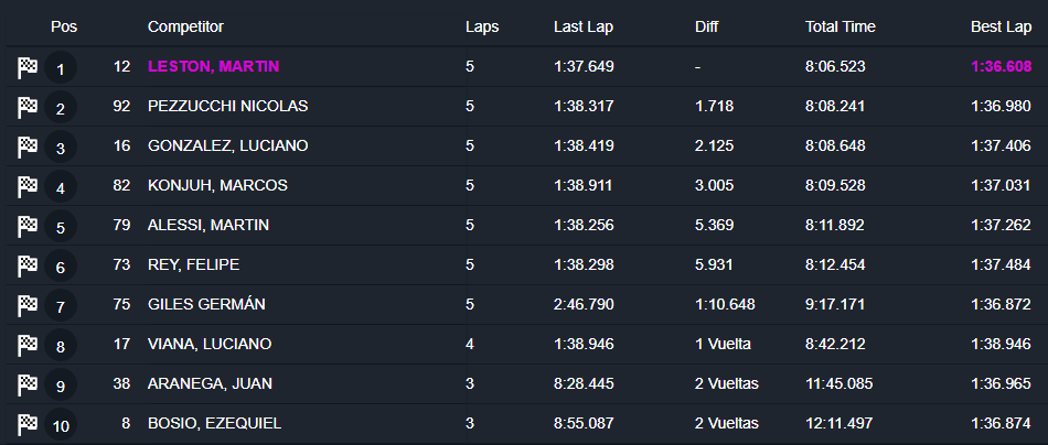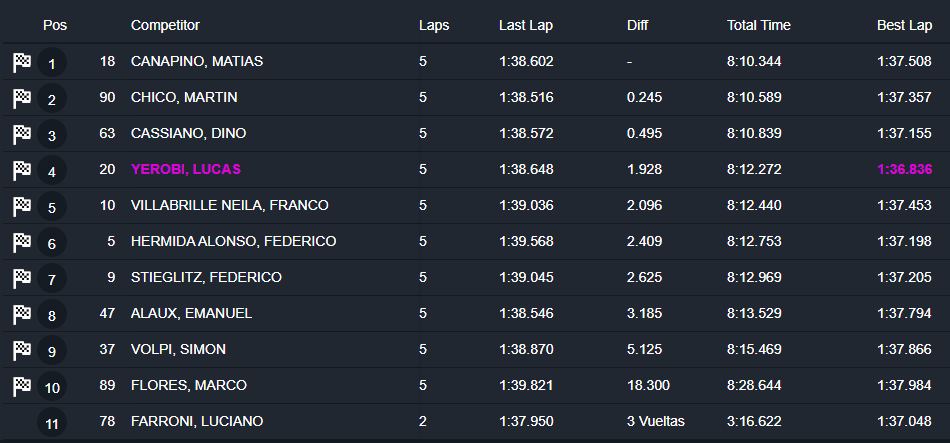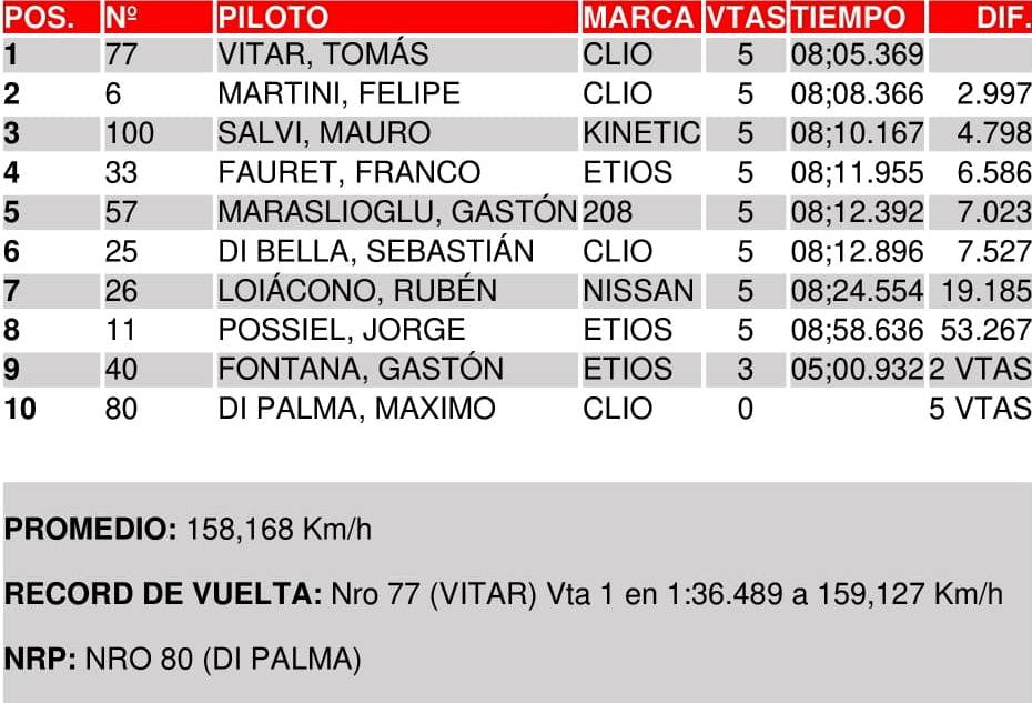 El arrecifeño debió exigirse al máximo para lograr su 4ª victoria parcial de la temporada, ya que Martín Chico (Fiat Argo) superó a Dino Cassiano (DS3) y fue a buscar al arrecifeño. El necochense se le puso a la par un par de veces, pero el piloto del Febase Performance resistió y cruzó la meta con una diferencia de 0s245 a su favor.