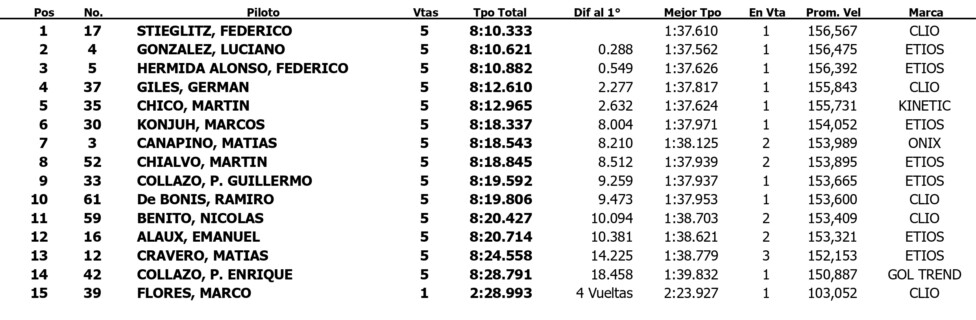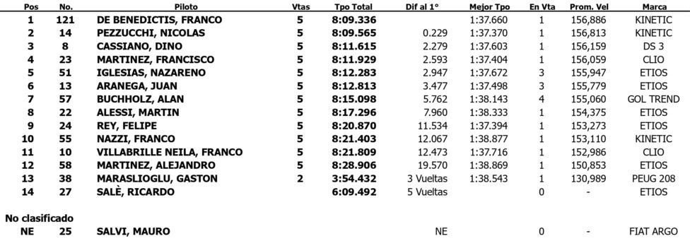 En la serie que abrió la actividad dominical en el “Roberto Mouras”, De Benedictis defendió con éxito el liderazgo del ataque constante de Nicolás Pezzucchi (Ford Fiesta Kinetic), que terminó 2º a sólo 0s229 y marcó el récord de vuelta. Dino Cassiano (DS3) avanzó desde la 5ª posición de partida y se quedó con el 3º puesto, que Felipe Rey (Toyota Etios) debió resignar a raíz de un problema en el amortiguador delantero derecho.