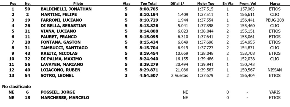 Baldinelli tuvo que esforzarse en las primeras vueltas de la 2ª serie para contener a Luciano Farroni (Peugeot 208). Esto posibilitó el acercamiento de Felipe Martini (Renault Clio), quien aprovechó una merma sobre el final en el motor del chubutense para superarlo en la última vuelta y apropiarse del 2º puesto, a 1s409 del porteño.