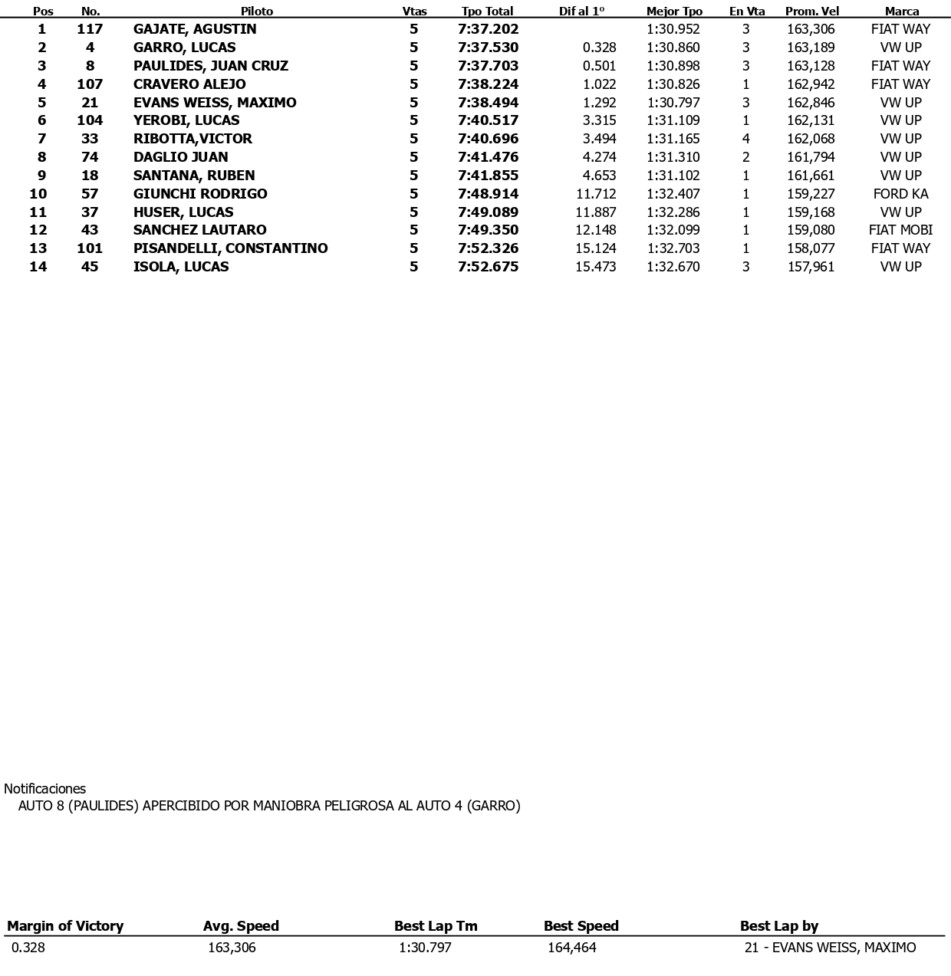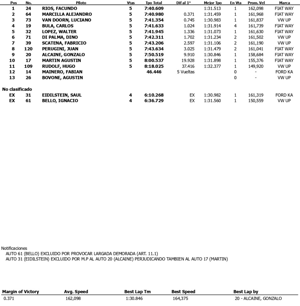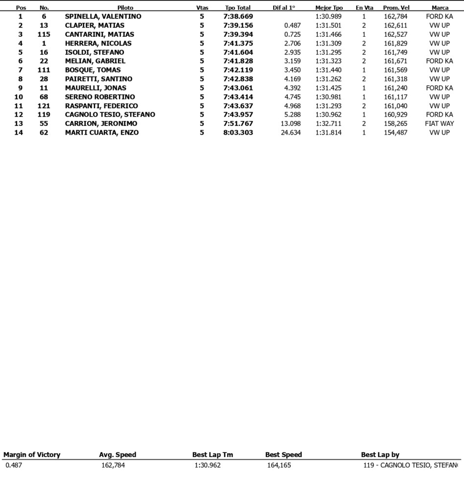 El dolorense Facundo Ríos, con el Fiat Uno Way del DT Racing, se adjudicó el parcial más lento luego de doblegar con una ajustada maniobra a Alejandro Marcilla (Fiat Uno Way) en la anteúltima curva. El olavarriense Valentino Spinella (Ford Ka) superó a Matías Cantarini (VW Up) en la primera curva, mientras que el chaqueño Agustín Gajate (Fiat Uno Way) fue más asombroso aún, ya que ingresó 4º al giro final y aprovechó un toque de Juan Cruz Paulides (Fiat Uno Way) a Lucas Garro (VW Up) para saltar a la punta.