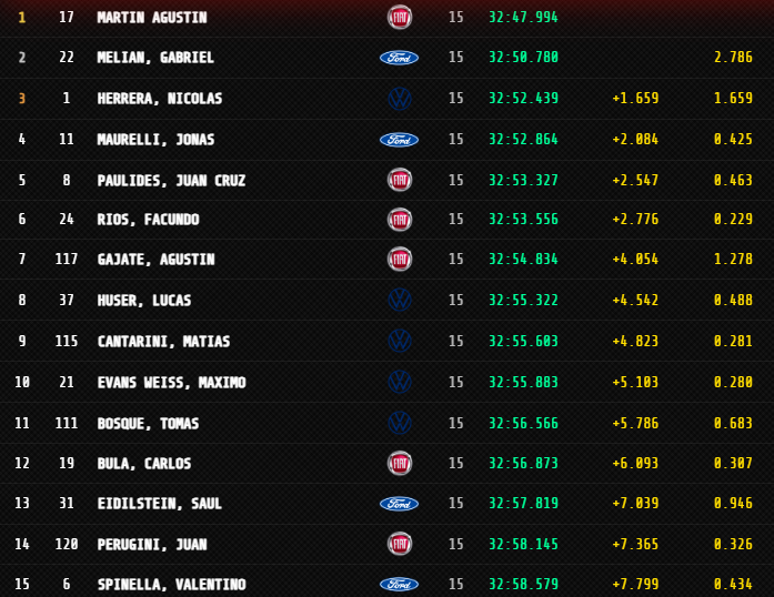 El ganador largó desde la “pole position” y se impuso de punta a punta en una Final que para lo que suele ser la Clase 2, entregó pocas emociones en los puestos de vanguardia. El cordobés tuvo como escolta en los 12 primeros giros a Máximo Evans Weiss (VW Up), quien se retrasó en la reanudación de la 13ª vuelta, cuando Gabriel Melian (Ford Ka) capturó la posición de escolta con una gran maniobra sobre el de Pehuajó y Jonás Maurelli (Ford Ka).