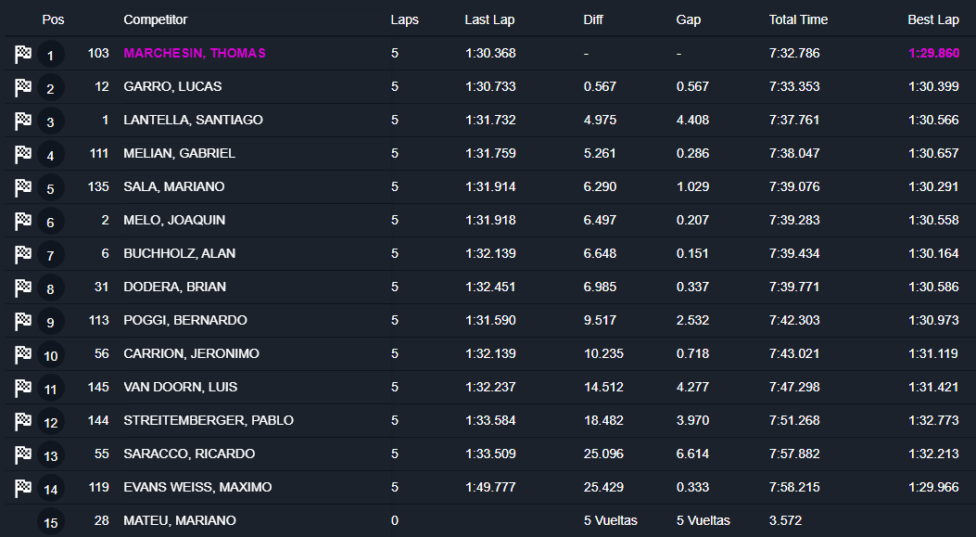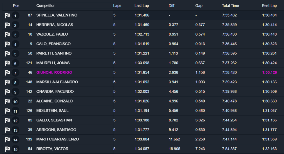 La segunda batería también ofreció un gran espectáculo, con dos protagonistas excluyentes: Lucas Garro (VW Up) y Thomas Marchesín (Fiat Uno Way). El quilmeño del Simeonoff Racing pudo prevalecer por 0s567 sobre el fueguino del Atlas Racing para llevarse su 2º triunfo en series de la temporada 2025 (la otra fue en Río Cuarto).