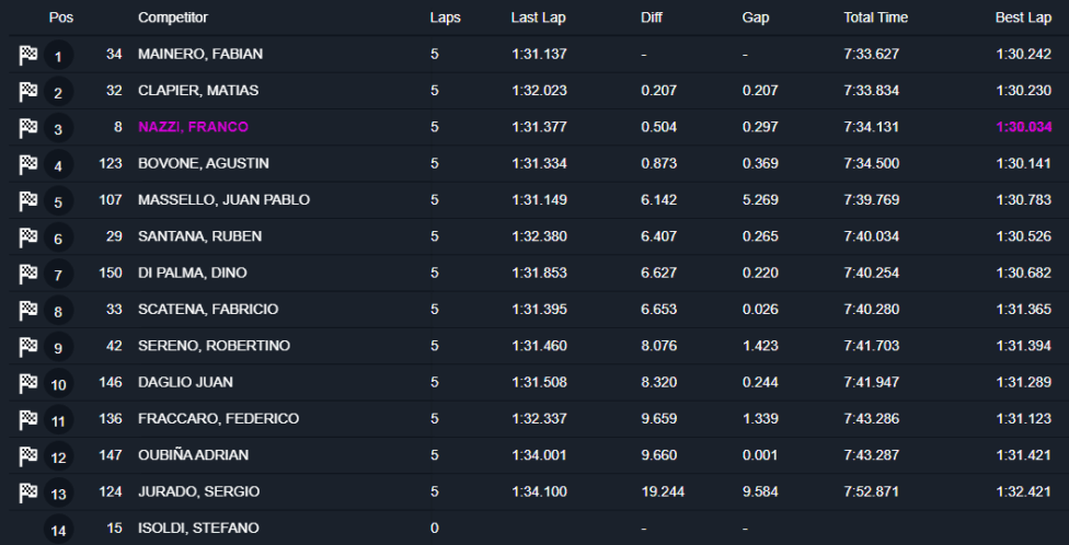 El tercer parcial fue el que menos variantes tuvo en la lucha por el liderazgo, pero aún así el ganador saltó a la punta en la última vuelta. Fue cuando el rafaelino Fabián Mainero (Ford Ka) logró vencer la resistencia de Matías Clapier (VW Up), quien había largado desde la “pole position”, para llevarse su 1ª victoria parcial de 2025, superando por 0s207 al jujeño.