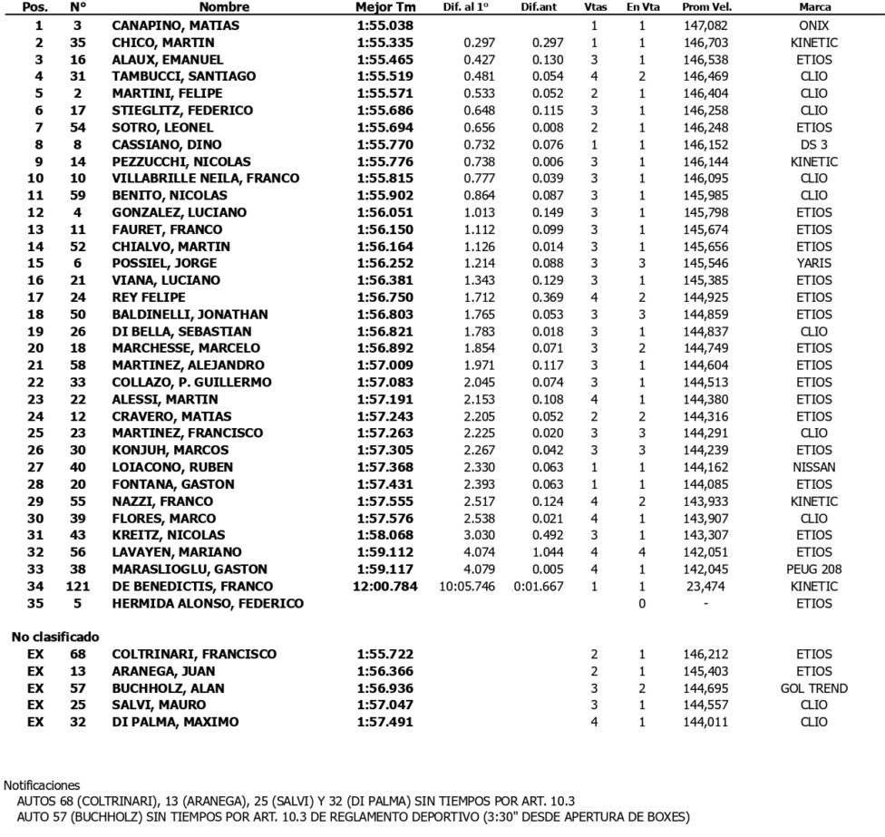 El arrecifeño del Febase Performance, que había sido 4º y 3º en los entrenamientos, marcó para su mejor vuelta clasificatoria un tiempo de 1m55s038 y aventajó a Martín Chico (Ford Fiesta Kinetic) por 0s297. “Fue una muy buena clasificación, agarré una muy buena chupada. Es muy bueno arrancar así. Ya tenemos un muy buen tiempo, así que podemos arriesgar en la segunda tanda”, indicó Canapino en Campeones Radio.